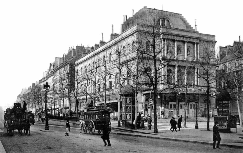 Le théâtre de l’Ambigu-Comique, après avoir brûlé en 1827 sur le boulevard du Temple, a été reconstruit sur le boulevard Saint-Martin. Comme son petit frère le théâtre de la Renaissance inauguré cinquante ans plus tard, sa façade ne donnait pas sur le boulevard, mais sur une place en retrait, l’un et l’autre se tournant le dos avec, entre eux, le majestueux théâtre de La Porte-Saint-Martin.