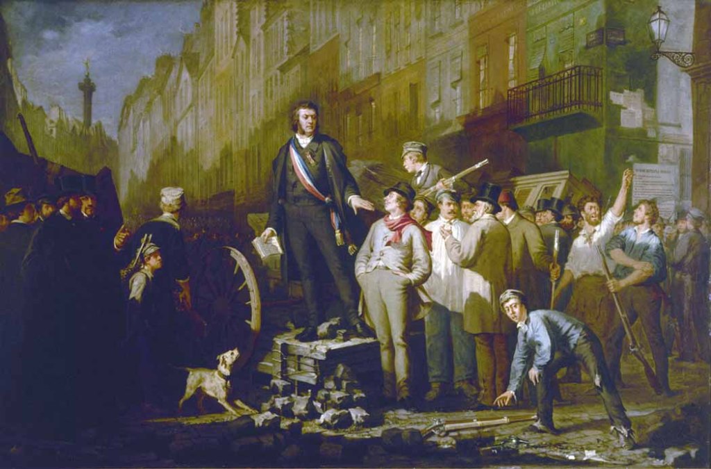 3 Le médecin et député Alphonse Baudin (1811-1851), suite aux insurrections provoquées par le coup d’État du deux décembre 1851 est mort sur une barricade, rue du Faubourg-Saint-Antoine. L’action a plusieurs fois été représentée en peinture, comme ici en 1869 par Pic (Ernest Pichio, 1826-1893).