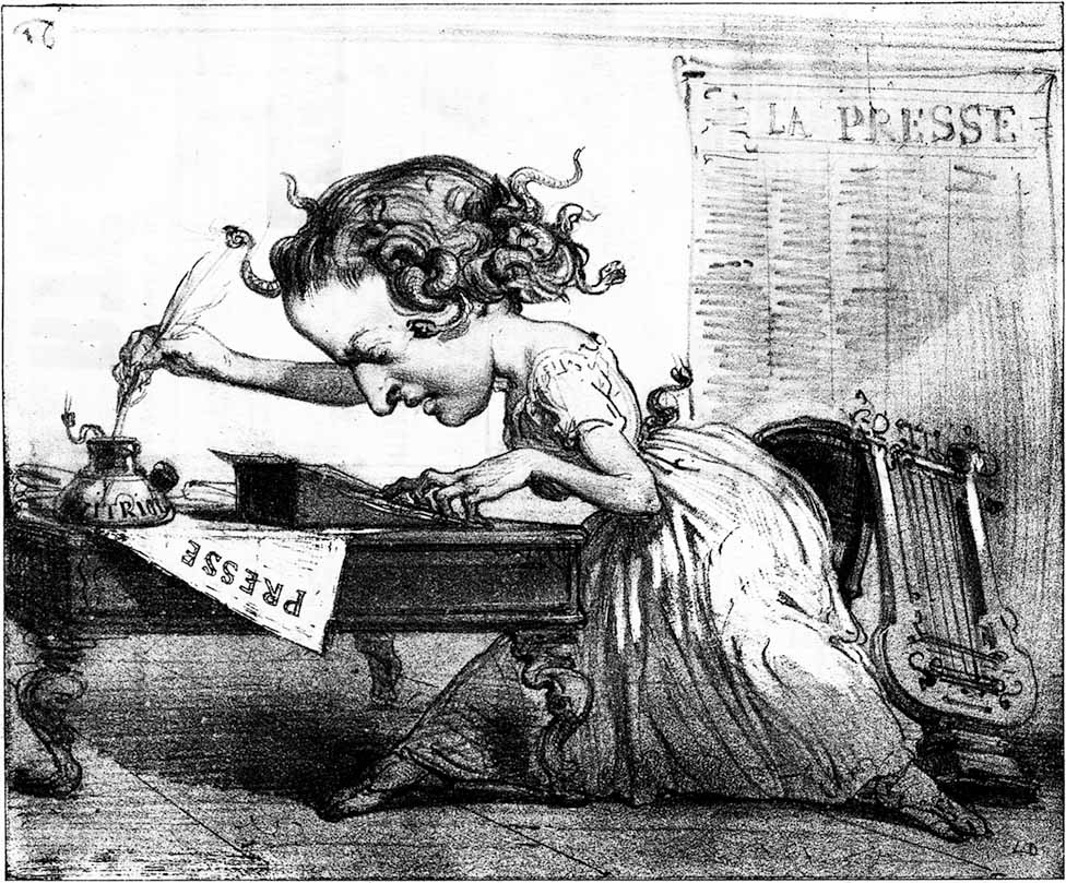 Delphine Gay dans Le Charivari du quinze décembre 1848. En haut à droite La Presse, journal d’Émile de Girardin.