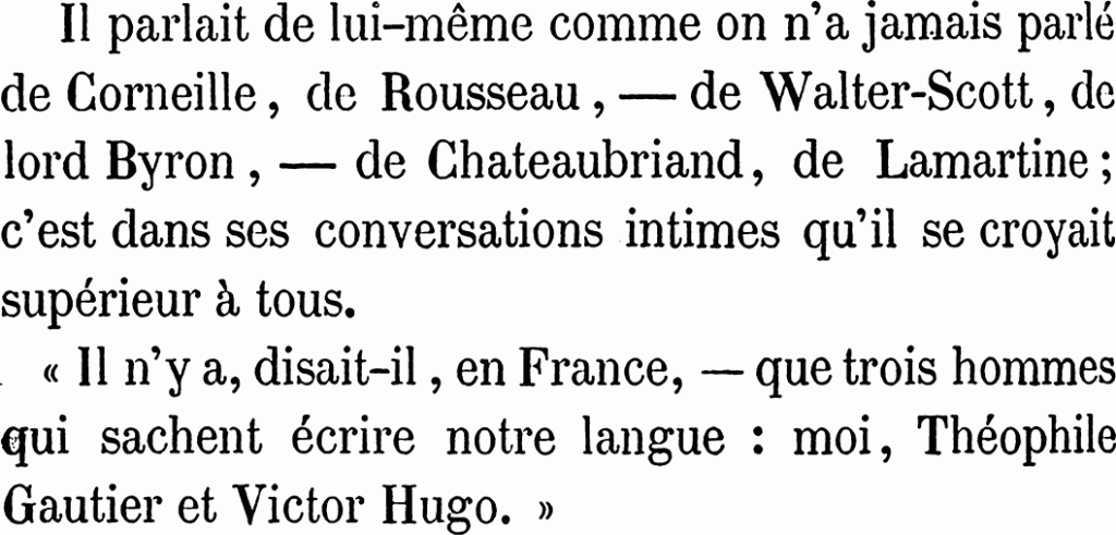 La partie littéraire du livre est plus instructive. Si Balzac se jugeait lui-même avec une extrême complaisance, il avait les mêmes provisions d’enthousiasme au service de ses contemporains. Étranger aux idées modernes par ses instincts politiques, il professait en revanche une admiration fort vive pour la résurrection littéraire de 1830 :