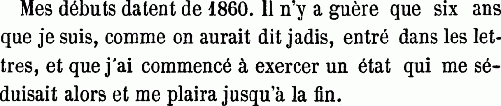 Mes débuts datent de 1860. Il n’y a guère que six ans que je suis, comme on aurait dit jadis, entré dans les lettres, et que j’ai commencé à exercer un état qui me séduisait alors et me plaira jusqu’à la fin.