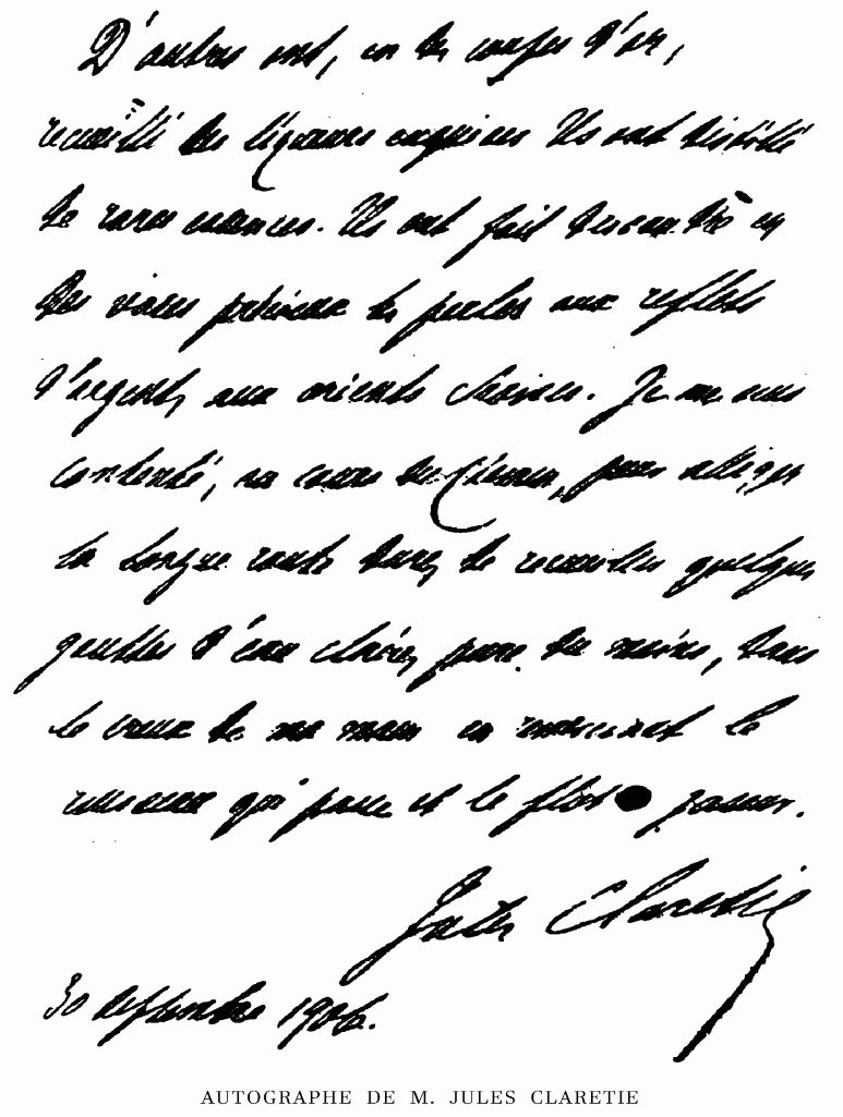 Or, ces renseignements nous intéressent, nous aussi. Avant tout, parce qu’ils nous montrent que le jeune et… « brillant chroniqueur », pour employer la formule consacrée, n’était pas du tout assuré de son avenir. Sa timidité, sa modestie lui faisaient craindre d’aborder franchement la littérature, et puis aussi, parce que nous voyons que M. Claretie hésitait entre la poésie et la prose. Il demandait en effet à Vigny les conditions requises pour participer au concours de poésie de l’Académie Française…