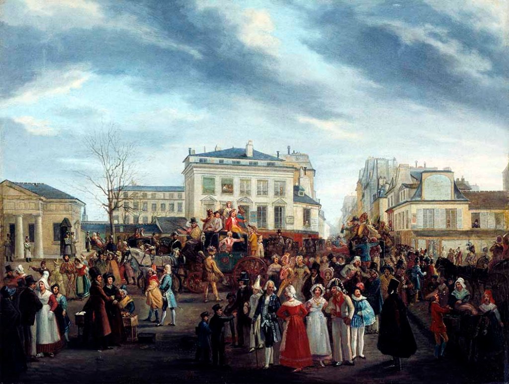 Artus Despagne, La Descente de la Courtille, le mercredi des Cendres 1823 (Musée Carnavalet). Dans l’axe, l’entrée de la rue de Belleville vers l’ouest