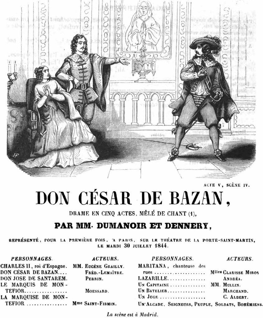 43 Dumanoir et Adolphe d’Ennery, Don César de Bazan, (mélo)drame en cinq actes, mêlé de chants créé par Frédérick Lemaitre le trente juillet 1844 au théâtre de la Porte-Saint-Martin.
