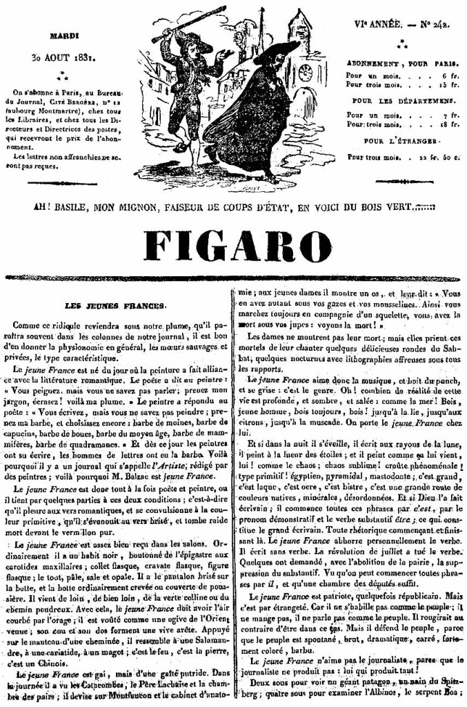 6 Les Jeunes France étaient, à l’époque de la création d’Hernani, un mouvement de jeunes romantiques qu’un journal avait tenté de rassembler sous ce titre, La Jeune France. Le journal n’a chanté qu’un été (1829) mais l’expression est restée, notamment, deux ans plus tard, par un article hostile paru en une du Figaro (celui de la première époque) du mardi trente août 1831. Cet article n’est hélas pas signé :