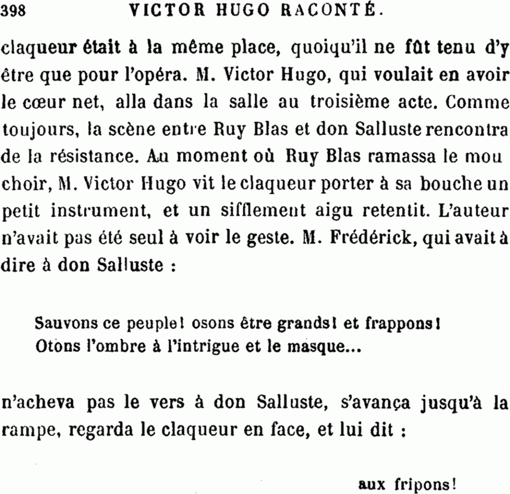 Frédérick-Lemaître remarqua même souvent que tel spectateur qui couvrait de bravos l’opéra-comique, sifflait le drame avec persistance. Un soir que l’acteur avait à dire à Don Salluste :
