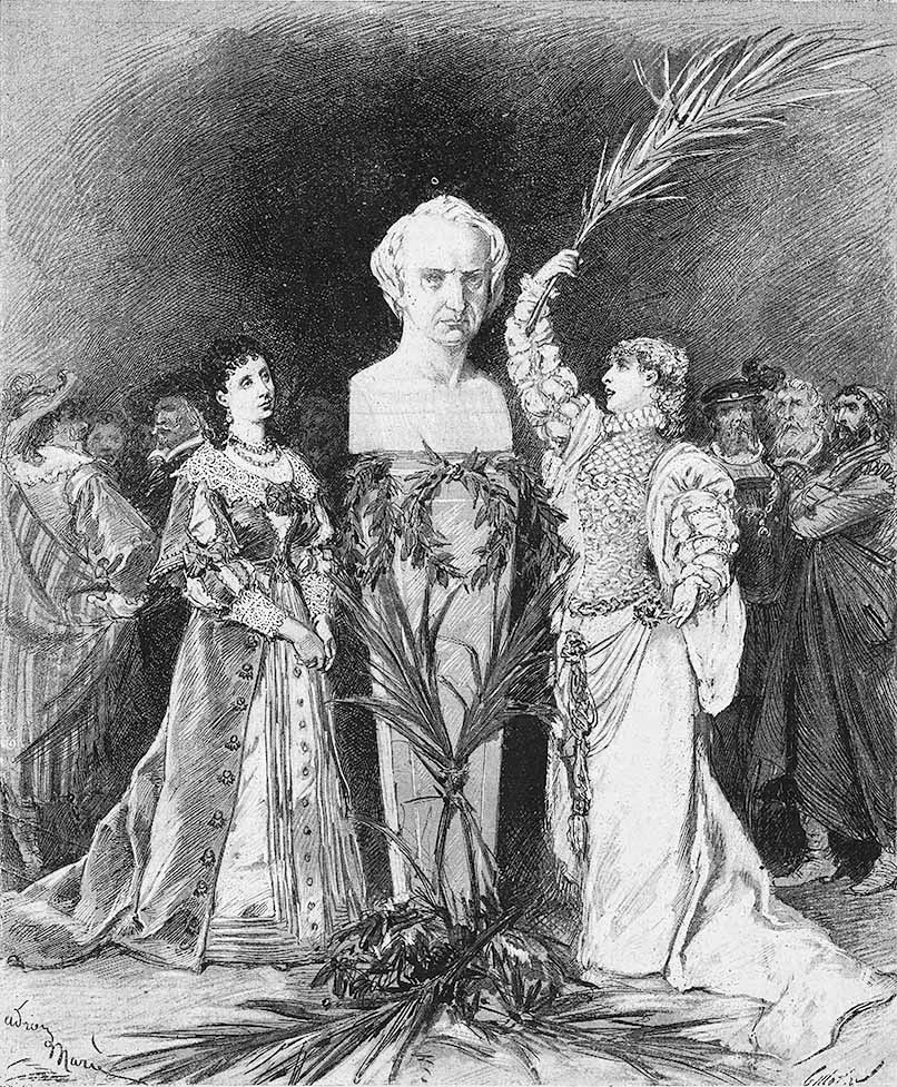 Image extraite de la couverture de l’hebdomadaire Le Monde illustré du six mars 1880, complétée de la Légende : « Le cinquantenaire d’Hernani à la Comédie-Française — Mademoiselle Sarah Bernhardt disant La Bataille d’Hernani par François Coppée devant le buste de Victor Hugo. Dessin d’Adrien Marie »