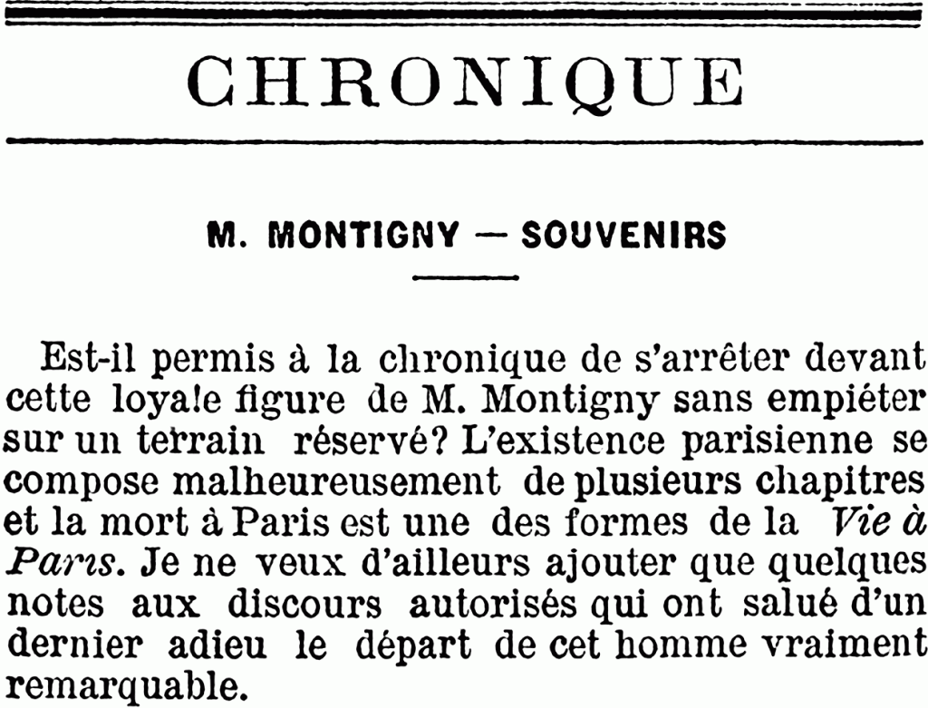 Est-il permis à la chronique de s’arrêter devant cette loyale figure de M. Montigny2 sans empiéter sur un terrain réservé3 ? L’existence parisienne se compose malheureusement de plusieurs chapitres et la mort à Paris est une des formes de la Vie à Paris. Je ne veux d’ailleurs ajouter que quelques notes aux discours autorisés qui ont salué d’un dernier adieu le départ de cet homme vraiment remarquable4.