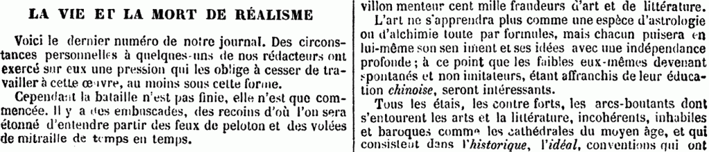 « Au premier numéro, on aura vu la bête Réalisme se traîner sur le ventre, comme les animaux naissant du chaos, puis peu à peu se dégager, et enfin le loup, avec son poil hérissé, marcher dans les chemins et montrer ses dents aux passants inquiétés. Aujourd’hui la bête est morte et elle va être empaillée par les naturalistes pour figurer dans les collections. — Réjouissez-vous ! Réalisme est mort, vive le Réalisme ! »