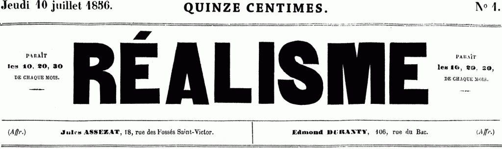 Il est bien curieux pourtant, il méritait d’être feuilleté. C’est un recueil grand in-8o, d’un texte serré, dont le premier numéro porte la date du jeudi 10 juillet 1856 et ce simple titre : Réalisme41, avec cette indication « en manchette » comme on dit : Paraît les 10, 20, 30 de chaque mois. Puis deux noms en tête : Jules Assézat, 18, rue des Fossés-Saint-Victor, et Edmond Duranty, 106, rue du Bac, avec l’avertissement : (Affr.). Duranty signait, en qualité de gérant, cette feuille belliqueuse, qui eut six numéros et deux imprimeurs, d’abord Moquet, rue de la Harpe42, ensuite de Soye et Bouchet, place du Panthéon43, selon les fluctuations du crédit.