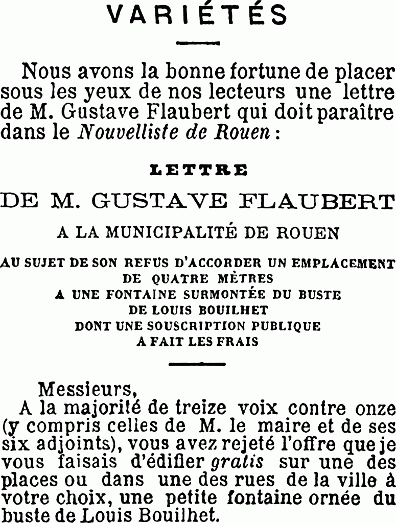 Avec Madame Bovary, Flaubert avait, en quelque sorte, pris possession des rues de Rouen et de la campagne normande, comme George Sand des traînes6 du Berri et des ruisseaux de la Vallée Noire. On ne peut plus passer à Rouen sans se rappeler les promenades d’Emma, et l’image, le fantôme de ces êtres qui n’ont pas vécu, y paraît plus vivant que les passants eux-mêmes. Flaubert en voulait un peu aux Rouennais depuis leur refus de placer, sur une fontaine publique, un buste de son ami Louis Bouilhet7, refus qui fit écrire à Flaubert un des rares articles de polémique échappés à sa plume et que le Temps publia à son heure8.