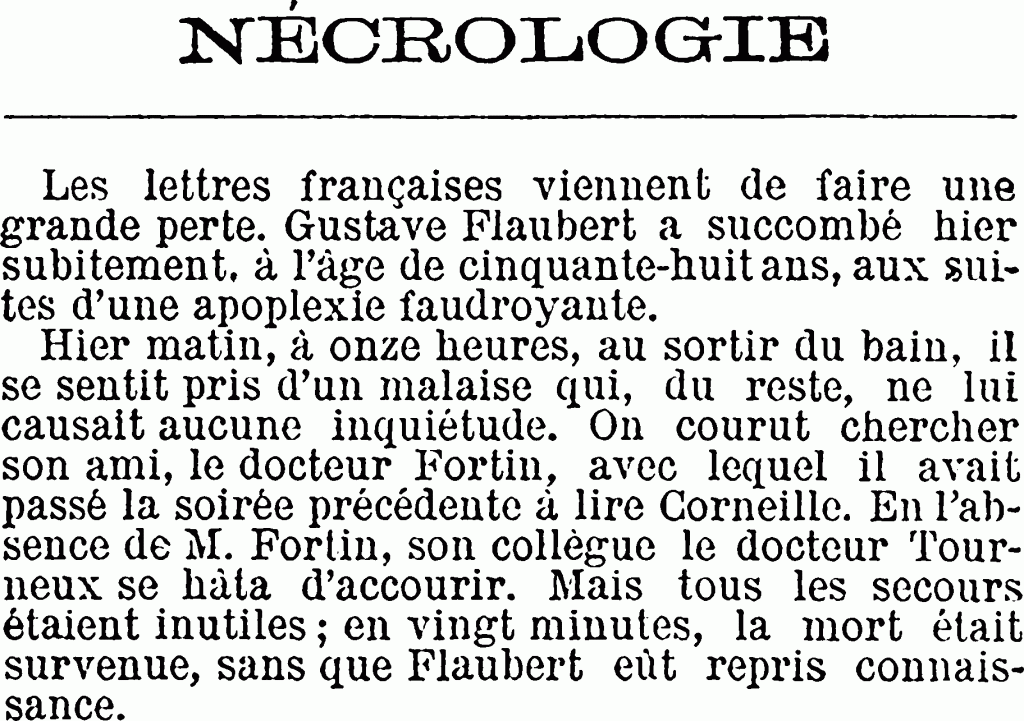 1 Gustave Flaubert, né en décembre 1821, a vécu à peine plus de 58 ans. Il est mort d’une hémorragie cérébrale, le samedi huit mai dans l’après-midi. Jules Claretie écrit « hier » mais Le Temps, journal du soir, est antidaté et ce numéro du dix est paru à Paris le neuf. Lire aussi l’excellent article de Louis de Fourcaud, près de trois colonnes en une du Gaulois du neuf mai.