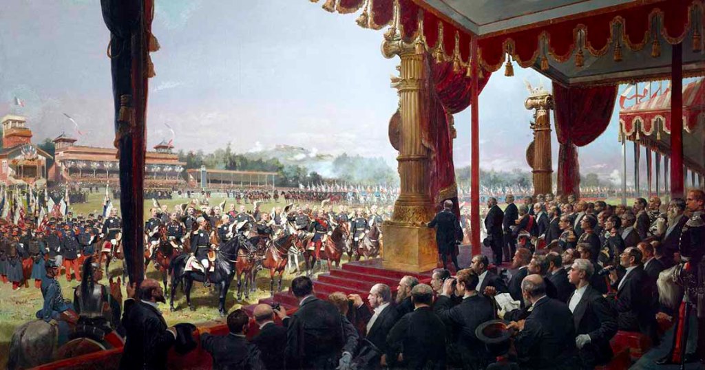 Édouard Detaille (1848-1912), La distribution de ses nouveaux drapeaux et étendards à l’armée française sur l’hippodrome de Longchamp, le 14 juillet 1880, grande toile de près de trois mètres sur cinq, musée d’Orsay, visible au musée de l’armée