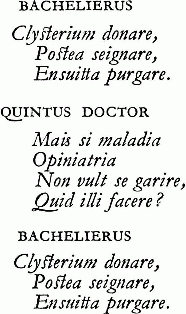 48 Le discours macaronique est assimilable au grommelot, langage inexistant et souvent incompréhensible imitant un langage réel. L’exemple le plus connu en français se trouve à la fin du Malade imaginaire :