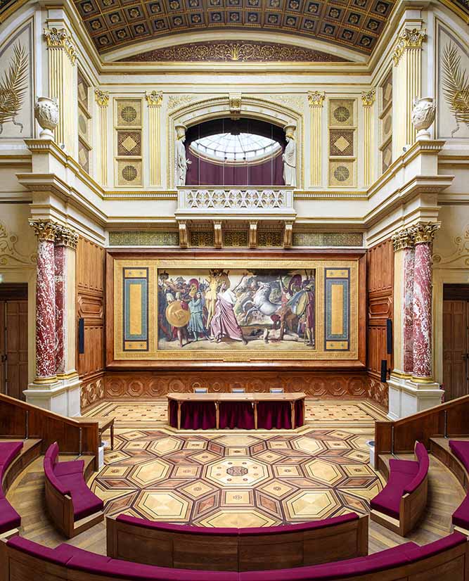 2 L’amphithéâtre d’honneur de l’école des Beaux-Arts, édifié de 1820 à 1841 par François Debret et Félix Duban a été entièrement restauré en 2011. Il est enrichi de la fresque en demi-cercle l’Hémicycle, dont il sera question note suivante.