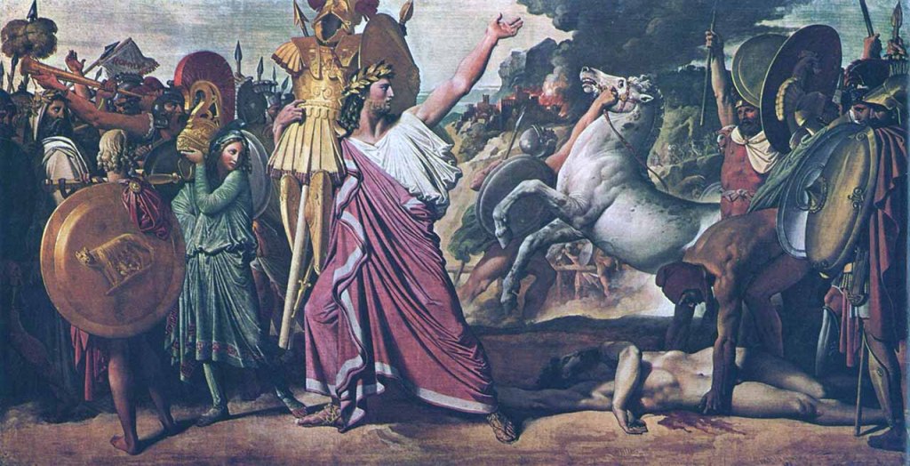 8 J.-A.-D. Ingres, Romulus, vainqueur d’Acron. Cette peinture « à la détrempe » de 1813 est visible dans l’amphithéâtre d’honneur, face au public (trois mètres sur cinq).