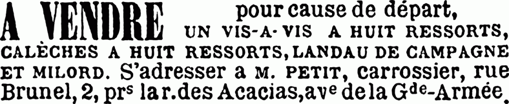 6 Le Figaro du dix juin 1860, dans la chronique de « Pierre », « Paris au jour le jour », À propos du mariage de « M. le vicomte Ponson du Terrail, homme de lettres, à Paris […] j’apprends que le marié trouvera dans la corbeille une calèche à huit ressorts établie par notre carrossier le plus habile. » Et dans Le Figaro du premier juin 1862, dans la rubrique « Nouveaux monuments de Paris » du prolifique Charles Monselet : « À deux pas de la rue de la Clé, dans un quartier éminemment paisible — loin des agitations du boulevard et des scandales à huit ressorts des Champs-Élysées »… Ces voitures, très confortables, servaient parfois à d’autres transports en évitant d’avoir à se montrer « en compagnie » dans un hôtel.